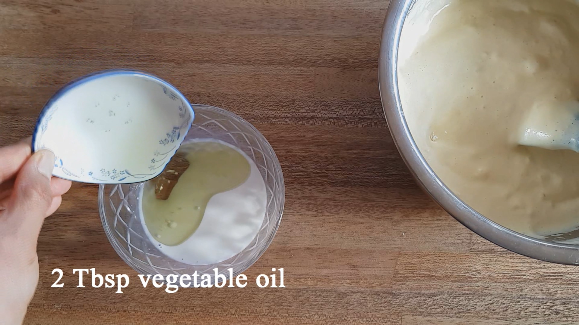 Add vegetable oil to warm milk, add 1 scoop of batter and mix together.