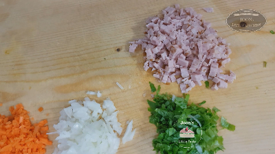 2. Chop the vegetables finely. If you have raw ham, cut it together. Onions are essential.